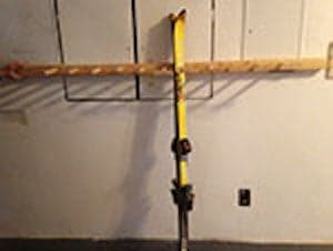 The ski holder has swiveling wooden plates that prevent the skis or ski poles from tipping forward.